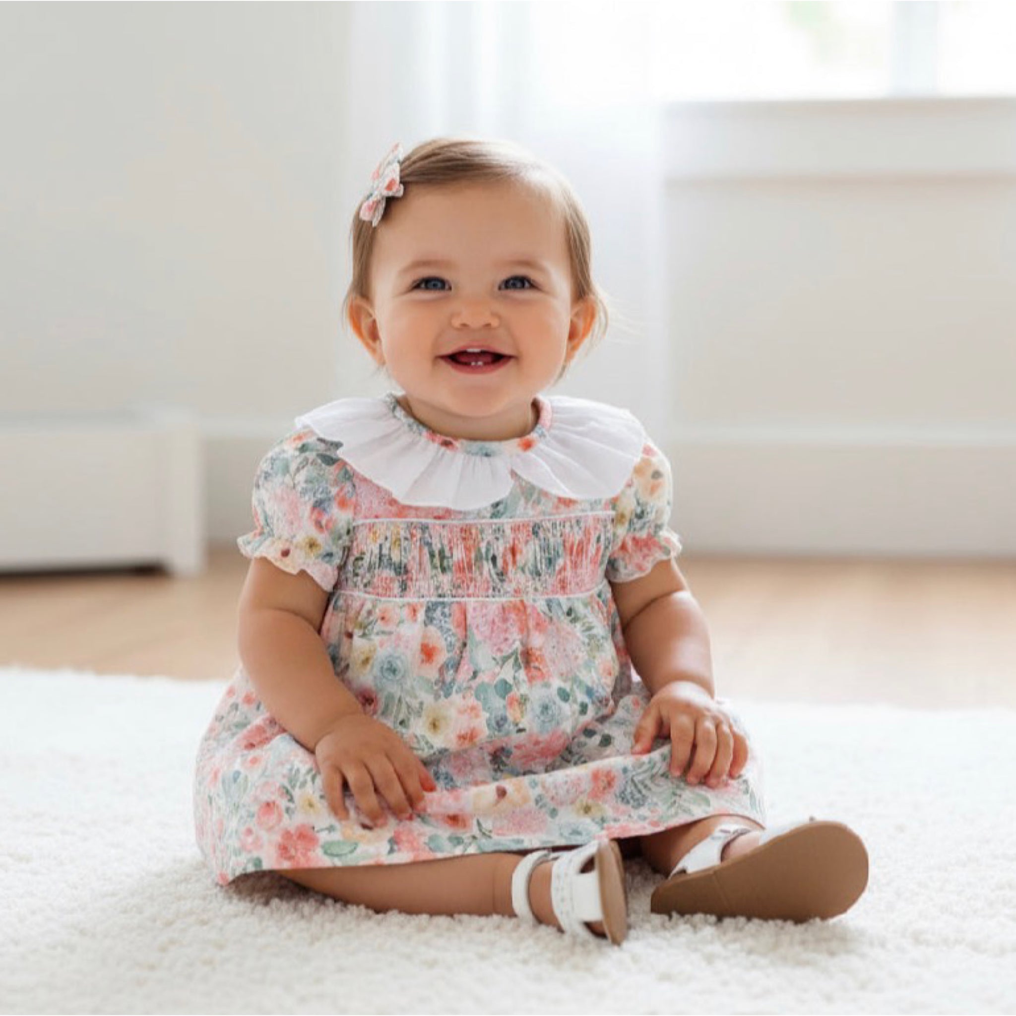 Crafted with meticulous attention to detail, this floral smocked baby dress combines timeless elegance with practical comfort.